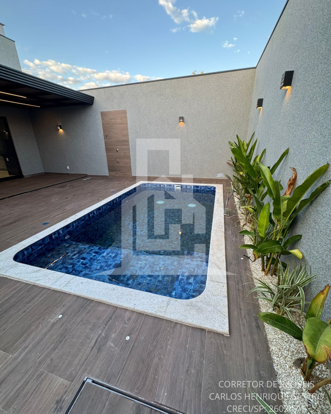 A área externa é um verdadeiro convite ao lazer: piscina em vinil com iluminação em LED, espaço com pergolado coberto e acabamento pensado nos mínimos detalhes para valorizar cada ambiente.